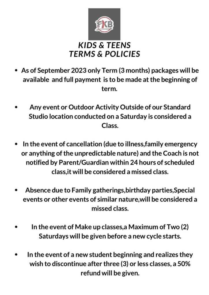 - Absense due to family gatherings, birthday parties, special events or other events of similar nature, will be considered a missed class.